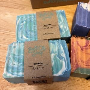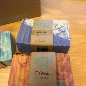 This listing is for four bars of Buff City Soap. All are brand new and in the original packaging. You get two bars of "Breathe" (smells like Peppermint and Rosemary), one bar of "Ohana" (smells like ice vanilla wood, apple mango and coconut) and one bar of "As You Wish" (smells like Honey, Lilac, Mango, Oatmeal, & Pomegranates). All of these smell wonderful, I just have more than I can use in a reasonable period of time.