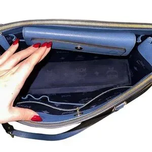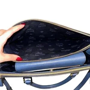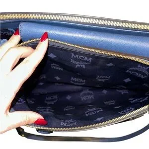 MCM leather tote with adjustable strap. It has one main compartment in the middle with two zipped compartments on the side. There is a zipped pocket inside the bag. It also has phone cable and document holders in the main compartment. The adjustable shoulder strap is between 100 to 115 cm. Gold hardware.