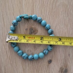 Stylish turquoise marble beaded bracelet with a turtle bead in the center. Perfect for any occasion.