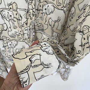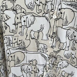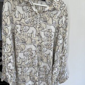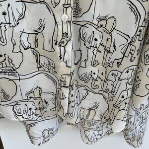 New without tag. Never worn. Whimsical black elephants on white print. Polyester. 27" pit to pit, 30" shoulder to hem, 12" sleeve can roll up.