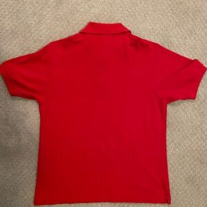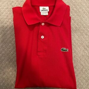 Red men’s size 4 (medium) Lacoste polo shirt. Worn but good condition. Non-smoking home. Washed and ready to go. Fast shipper! Good for spring and summer, a staple.