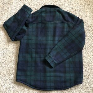 Uniqlo men’s shirt jacket, navy/green plaid, size M, back length 30”.