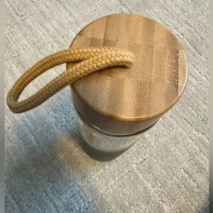New water bottle. Glass with gray silicone slip. Wood grain lid.