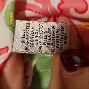 Lilly Pulitzer pink down vest with colorful white, pink, green and yellow lining.