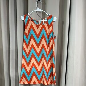 This relaxed tank top features a vibrant chevron pattern in bright blue and orange colors. Crafted from lightweight fabric, it drapes beautifully and is ideal for warm weather outings.