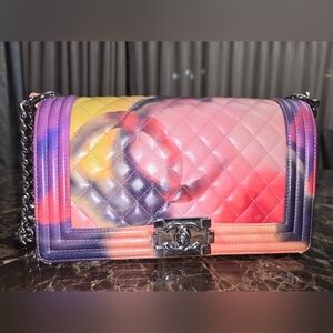Elevate your style with this stunning Chanel quilted bag. Featuring a vibrant multicolor design, this bag is perfect for adding a pop of color to any outfit. The luxurious craftsmanship and iconic Chanel branding make it a must-have accessory.