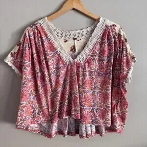 Free People Boho Cropped V Neck Top Leilani Floral Crochet Trim Blouse Medium
