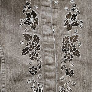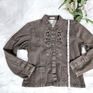 Stretchy Jacket in excellent condition. Beautiful embroidered front with pockets. See photos for actual measurements.