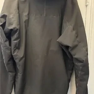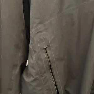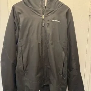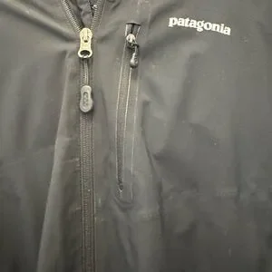 This Patagonia performance jacket features a sleek black color and a lightweight design, making it ideal for outdoor activities. It includes an attached hood for added protection against the elements and is crafted from synthetic fabric for weather resistance.