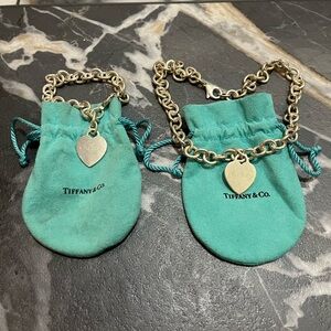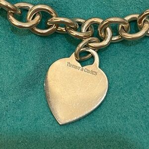 Iconic Tiffany silver chain necklace with heart charm. Comes with Tiffany blue pouch. Heart has monogrammed initials KKG engraved in cursive on one side and “Tiffany&Co 925” on the other. Lobster clasp has 925 stamp as well.