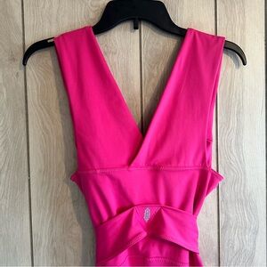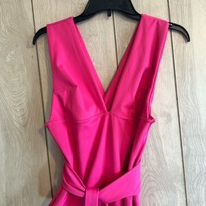 Be ready to work out anytime and anywhere with this sleek jumpsuit style onesie featured in a compressive design with a plunging V-neckline, sash tie waist and a 7/8 cropped length with a kick flare detail.