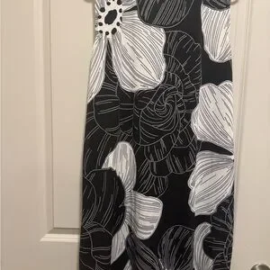 This striking black and white midi dress features a bold A-line silhouette with a modern v-neckline. The sleeveless design showcases a graphic pattern of large abstract shapes that create a stunning contrast against the black background. Made from a lightweight fabric, this dress is perfect for casual occasions.