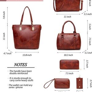 Dimensions of the 2E-youth women handbags 6pcs purse set: large tote bag:13.8"L x 4.7"W x 11"H,Handle height:7.8";middle tote bag:10.2"L x 5.1"W x 7.5"H;shoulder bag:11"L x 3.1"W x7.8"H;clutch:5.5"L x 3.7"H;purse:7.5"L x 3.7"H; key holder:2.2"L x 3.7"H.