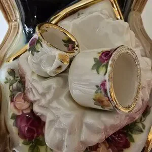 Vintage Floral Teacup in Chair Teapot. This teapot is Royal Albert inspired with the red, pink, and yellow roses. It has gold gilt details.