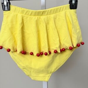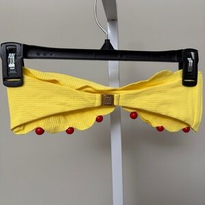 Stylish yellow two-piece swimwear featuring playful red accents. Perfect for a vibrant beach day.