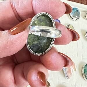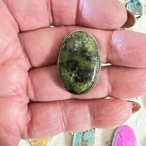 đź’• Natural serpentine gemstone, oval, silver plated, overlay stamp 925 ring size 6