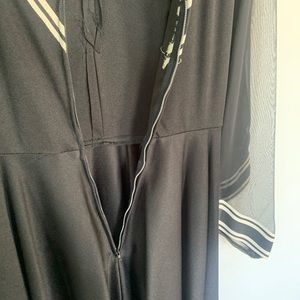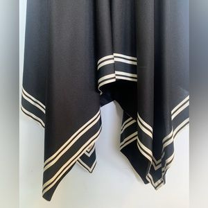 Absolutely stunning 1970’s black cocktail dress with handkerchief hem and sheer bell sleeves in excellent condition. Black and ivory trim, on a feminine, flowy handkerchief skirt and deep -v neckline. Back full zipper, fitted dress with flare skirt. See photos for measurements
