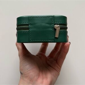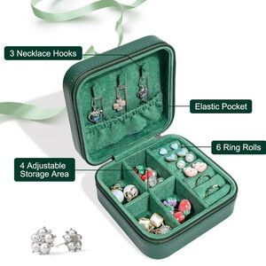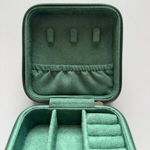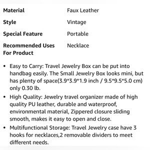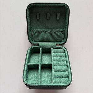 Brand new, never used. Contains 3 necklace hooks, 6 ring rolls, & a 4 grid storage area. Zipper is fully functional & zips around the entirety of the case. Included product pics w/ dimensions for reference.