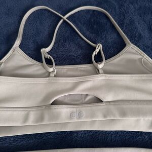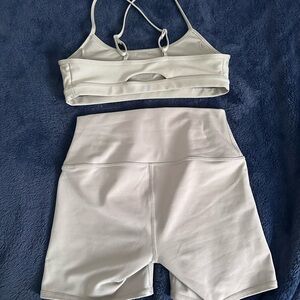 Limestone alo yoga sports bra and bike short set. Worn twice, perfect condition. Size small bike short and medium sports bra