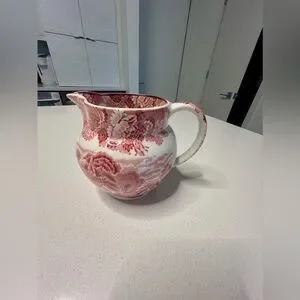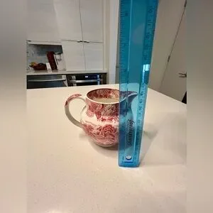 The Woods Ware English Scenery milk jug pitcher is a charming piece of cream and red transferware china. This pitcher features a traditional English countryside scene in a classic transferware style, adding a touch of vintage elegance to any dining or kitchen setting. Made of ceramic in China, this pitcher is perfect for serving milk or other beverages with a quaint and nostalgic flair.