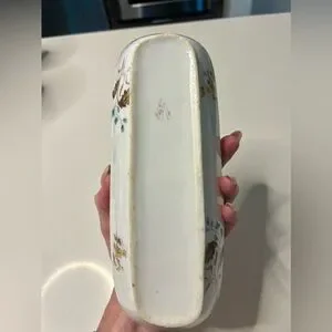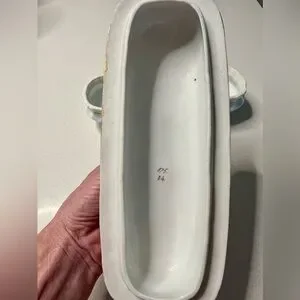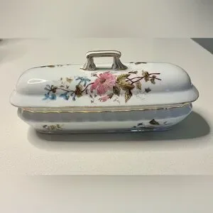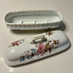 This antique lidded pen tray features a beautiful floral pattern on multicolor porcelain, adding a touch of vintage charm to any space. The tray comes with a lid, making it a versatile piece that can be used for organizing pens or other small items. With its excellent condition and numbered design, this collectible item is sure to be a standout addition to any kitchen or home decor collection.