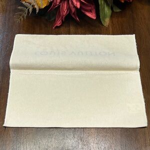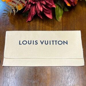 The dust cover features a sophisticated cream fabric complemented by bold black print . The iconic Louis Vuitton branding is prominently displayed, making it a luxurious addition to any accessory collection. Keep your collection fresh with this dust cover.