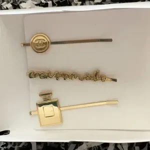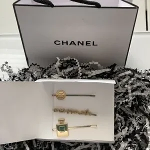 Elegant Chanel hair clips. Features gold accents. Perfect for any occasion.