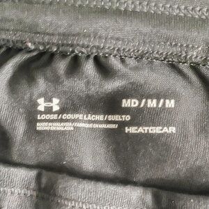 Comfortable 3/4 length black jogger pants. Features drawstring waist and cuffed ankles. Under Armour logo on the side.