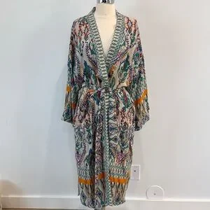 Long belted tunic, bikini cover up or throw on with some jeans. Colorful &flowy.