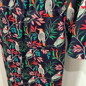 Boden navy jumpsuit with bird and floral print. Lapel neckline, button front and drawstring waist. 3/4 length sleeve. Beautiful satiny navy background with blues, red, orange, pink, greens, gray and taupe. SO PRETTY! Size 4P