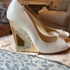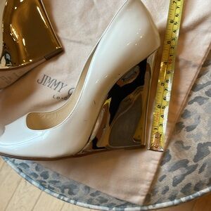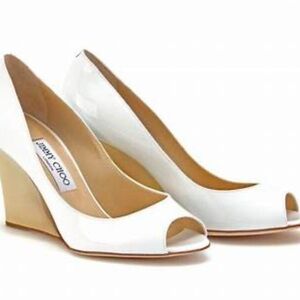 NWOT Jimmy Choo Baxton peep toe wedge shoes in white patent with beautiful gold metallic mirrored heel. 4 1/2 in. Never worn. Very slight mark on side hardly visible. Dust Bag included. Box an available on request.