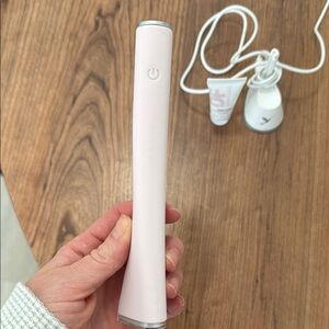 Sonic Dermaplaning + Peach Fuzz Removal Set in Blush. Includes charging base and small Preflash serum. No blades included. In perfect working condition, just don’t use it anymore. Has been disinfected.