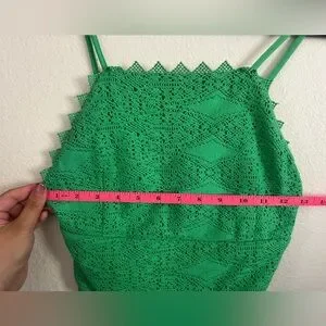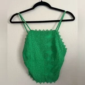 Make a statement with this bold green crochet crop top from Topshop. Featuring intricate crochet details and a vibrant hue, this top is the perfect addition to your summer wardrobe. Pair it with high-waisted shorts, skirts, or jeans for a trendy, eye-catching look.