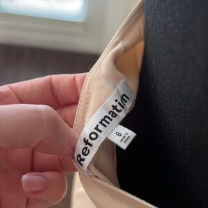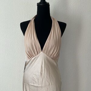 NWT Reformation Wyn Silk Dress in Prosecco Size 6. One small scratch on front of dress, pictured. It’s not super noticeable. 100% silk, sooo soft and such an elegant dress! Side zipper closure, adjustable halter tie.
