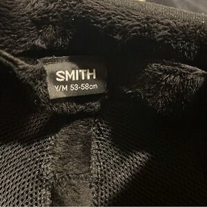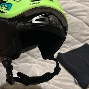 Smith youth size ski helmet. Bright neon/lime green color. Comfortable and protective. Padded/insulated ear flaps. Size Youth medium, 53-58 cm (fit my kid from about age 7-12.) Micro adjustment dial in back & a snap to secure goggles. Includes a fleece neck warmer!