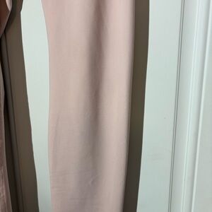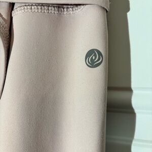 These are soft yoga/leggings in a light dusty rose color. They have a back tie that can be tied in the middle or side of the front. They also have inside and back of leg stitching seams. Depending on your height, they hit to mid to lower calf. Fabric is 88% polyester and 12% spandex, machine wash and dry. Measurements are length 33”, inseam 25” and waistband 26”.