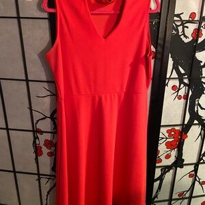 Beautiful red, flare at the bottom dress. Crepe polyester blend fabric with choker-style neckline.