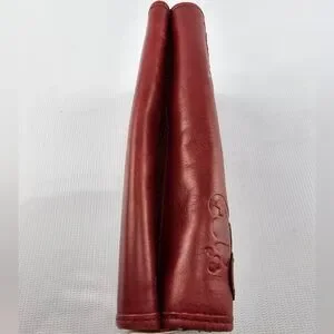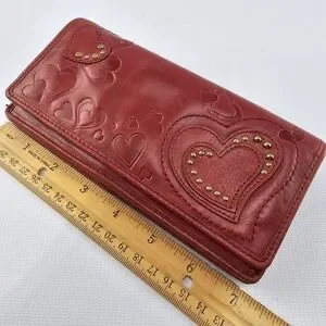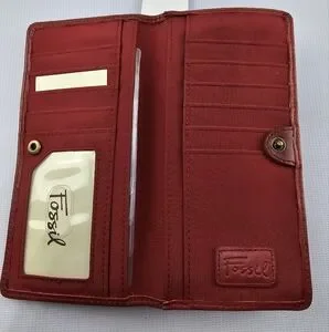 Soft red leather outside with embossed hearts on the front and Fossil name on back. Under the front flap, you will find a zip pocket, 3 full-length compartments and a clear ID slot with snap closure. Under back flap, you will find multiple card slots, an ID slot, full length slots, a plastic sleeve for photos or business cards and a snap closure. On the top side between front and back, there is an additional hidden full length slot as shown in photo #4.
