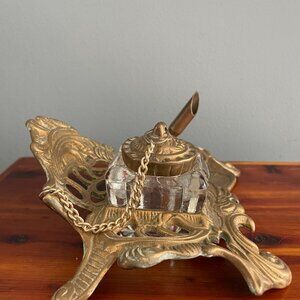 Vintage Brass Glass Inkwell Victorian Style Pen Holder