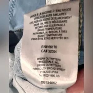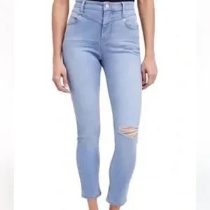 Mid rise; skinny fit through hips and thighs; skinny leg Approx. inseam: 27" Zipper and button closure; belt loops Off-seam pockets; two patch pockets Diagonal seam detail at front hip; rip at knee. Light blue wash with fading. Cotton/polyester.