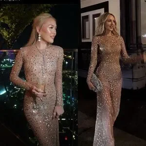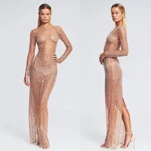 Experience sheer bliss in our Vinci Dress. This long-sleeve, crystal-embellished gown in sheer mesh features a back slit and hidden zipper with hook-and-eye closure at the center back. Pair it with your favorite bodysuit, lingerie and shapewear, all sold separately!