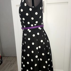Chic and stylish black dress featuring classic white polka dots and a vibrant purple belt. Perfect for any occasion. White House Black Market Suze 6.