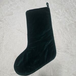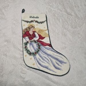 Personalized "Melinda" needlepoint wool stocking from Lands' End. Fully lined with dark green velvet back and hanging loop. Angel.