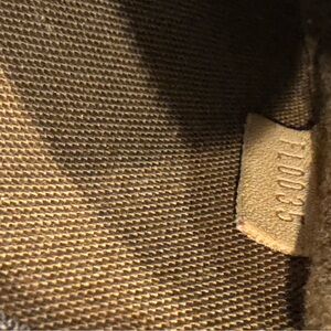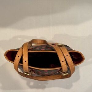 This Louis Vuitton Monogram Cerise Bucket is a Takashi Murakami limited edition design. It showcases wondering and wandering cherries on a cotton coated traditional Louis Vuitton Monogram canvas. The bag features natural leather handles that beautifully contrast with its darker body, making it a stylish accessory for any occasion. The interior of the handbag is red with a natural leather stitched border around both a slit pocket and a zippered pocket. Around the zippered pocket the leather is stamped Louis Vuitton Paris Made In France. A metal gold color zipper pull has an LV stamped on the front. There is a mini monogram cerise pochette inside the bucket bag which is on a detachable metal gold color chain. The interior of the mini pochette is a brown material with a date code tag, FL0035, and a small face powder spot on the lining, please refer to picture. The date code of the bucket bag is on the leather tab, also FL0035, that attaches the metal gold color chain to the interior of the bucket bag. There are 4 metal gold color feet on the bottom of the handbag. There are a very few water spots on bottom leather trim as noted in pictures, and one of the straps that attaches to the buckle has a few wrinkles, also noted in a picture. EUC