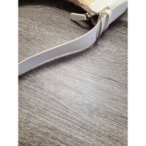 The Fossil 75082 Handbag is a stylish shoulder bag made from woven straw fabric with leather trim. This medium-sized purse features a zip closure and has a classic design that is perfect for casual occasions. The bag has a brown exterior color with white shoulder straps, silver hardware, and adjustable strap drop. It includes inner pockets, corner buckles, and a lined interior with a brown fabric lining. This Fossil handbag combines a vintage-inspired woven pattern with modern accents like a numbered pouch for a timeless yet functional accessory.