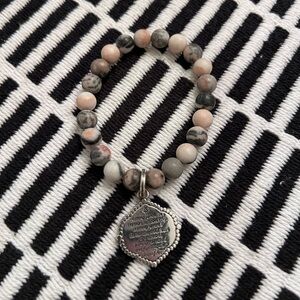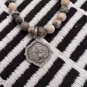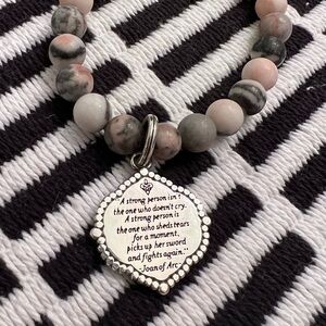 Brighton Joan of Arc stretch bracelet with silver charm and pink and grey beads.