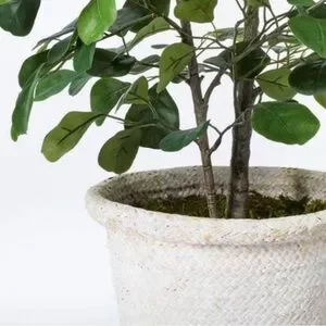 This artificial potted plant features a lush ficus tree housed in a woven rattan pot for a beautiful blend of classic and modern styles.