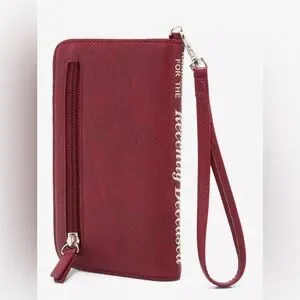 Need to summon Beetlejuice? Good thing you have this tech wallet with you! This faux leather wristlet can fit all of the essentials with a slot for your phone, two billfolds, 4 card slots and clear ID display with a zipper pocket on the outside. Features the infamous handbook from Beetlejuice with a matching detachable wrist strap.
