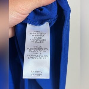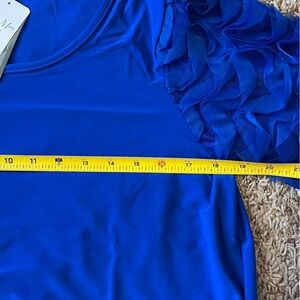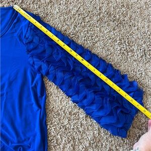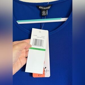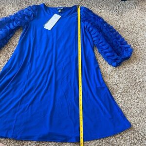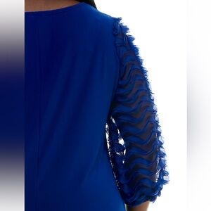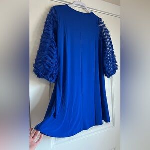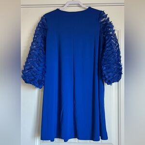 This is a stylish NWT Nina Leonard dress in size L designed with a trapeze silhouette and featuring textured mesh fabric. The dress has long balloon sleeves, giving it a trendy and unique look. The mini length and blue color add a touch of fun and sophistication to the overall design. Perfect for a night out or any special occasion, this dress combines fashion-forward style with comfort, making it a versatile choice for any woman's wardrobe.