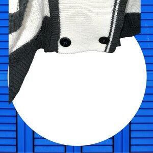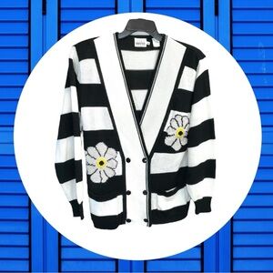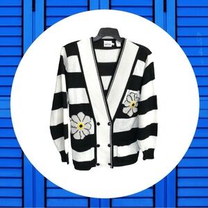 Vintage Leslie Fay Sportswear Black/White Striped Cardigan w Daisies Women Small